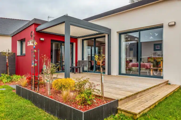 L’un des atouts majeurs de cette maison en Bretagne est sa terrasse en bois, prolongée par une pergola élégante. Véritable prolongement du séjour, cet espace extérieur offre un lieu de détente idéal pour profiter des beaux jours en toute saison.