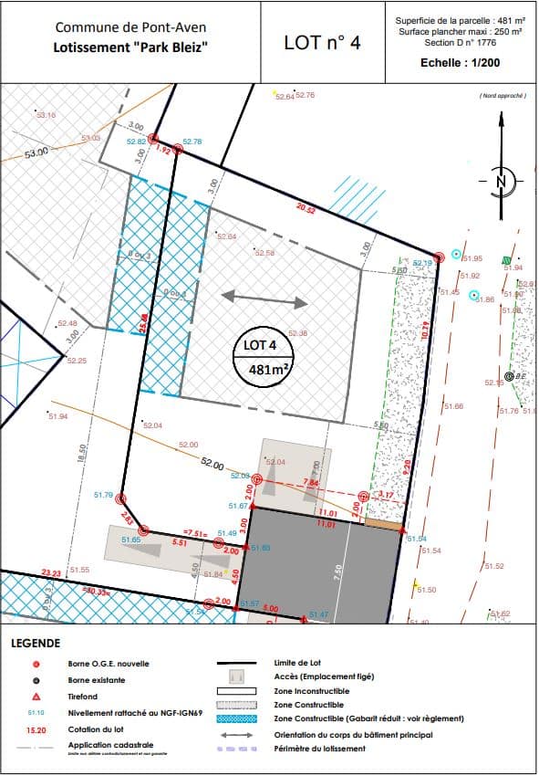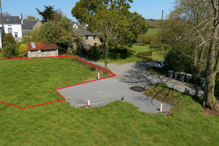Le terrain de 481m² est livré borné et viabilisé (eau, électricité fibre assainissement collectif). 250m² de surface plancher constructible – Dépôt de PC immédiatement possible
